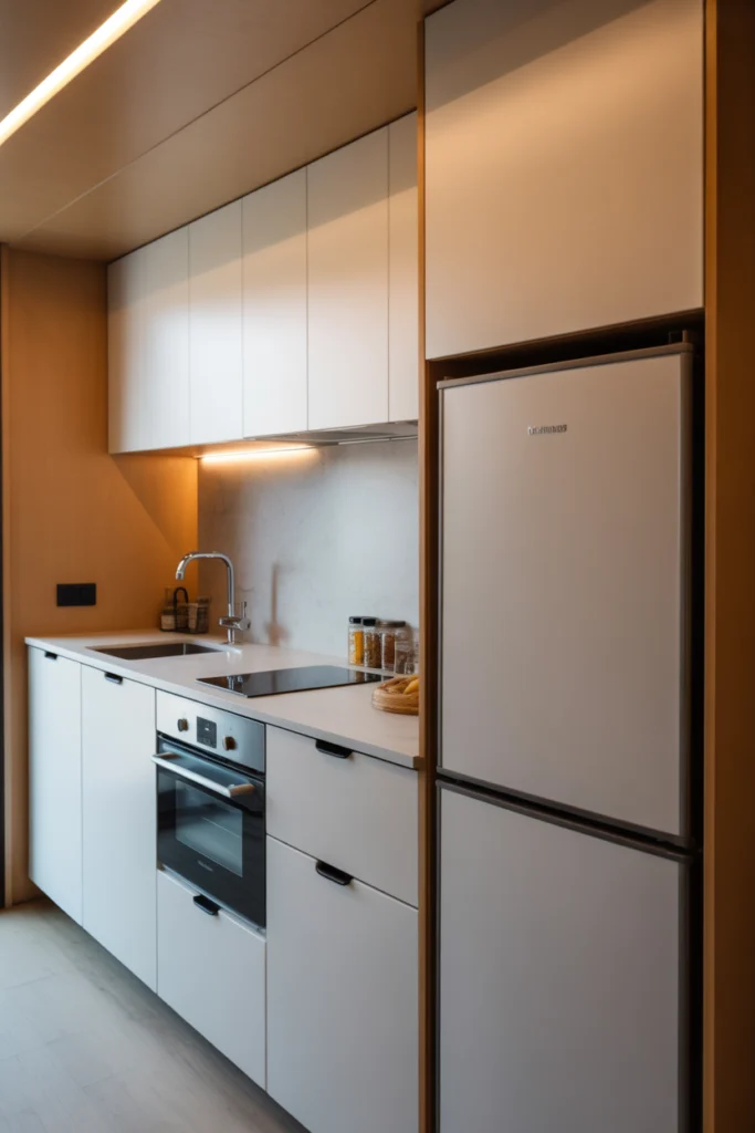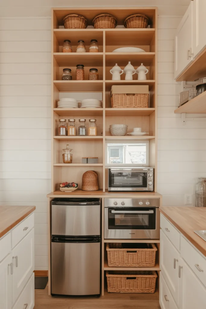 Customize towers with pull-out baskets, adjustable shelves, or integrated spice racks to optimize organization. Use door-mounted storage to maximize functionality. This Tiny House Kitchen Idea encourages efficient storage while maintaining accessibility and cleanliness. Tall slim cabinets add elegance and functionality to the overall design, helping small kitchens stay tidy and stylish.