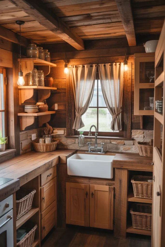 Rustic kitchens bring warmth and charm into tiny houses. Exposed wood beams, natural materials, and earthy tones help create a cozy, inviting environment. Rustic design pairs beautifully with small spaces because it adds character without requiring extra décor.