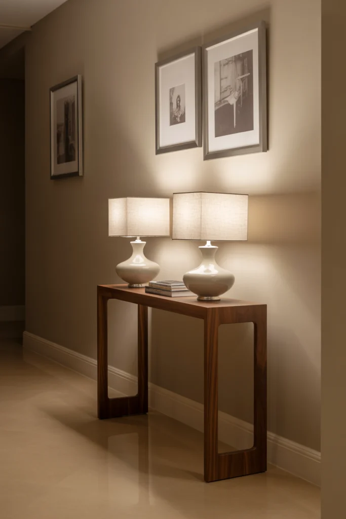 A slim console table adds storage and styling opportunities without blocking the walkway.