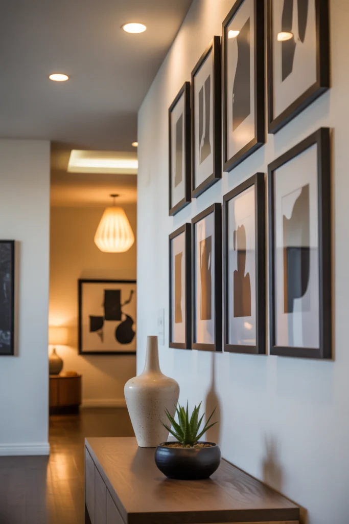 Arrange pieces symmetrically or in a curated, eclectic pattern depending on your hallway’s length and style. This approach turns a simple passage into a focal area full of character. Add a small console or ledge below the gallery for decorative items or plants.