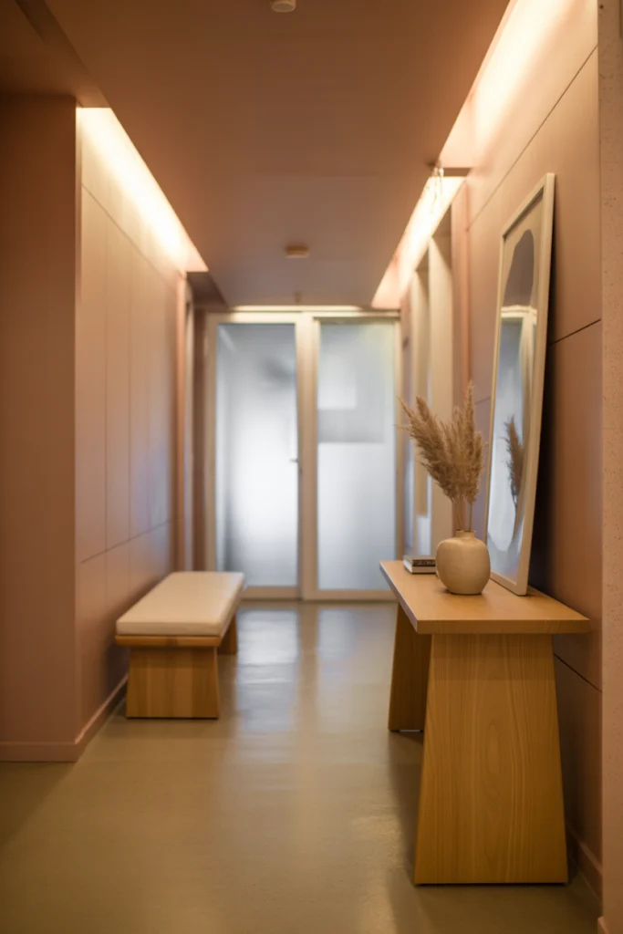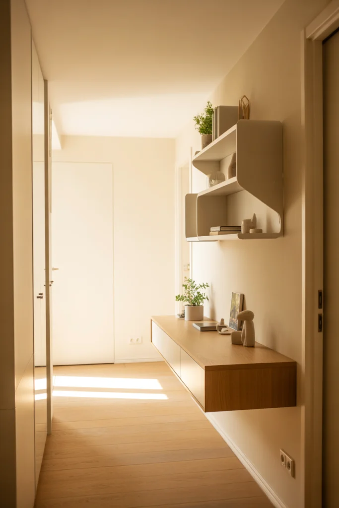 Floating shelves provide functional storage without crowding the hallway. Use them to display small plants, books, or decorative pieces.