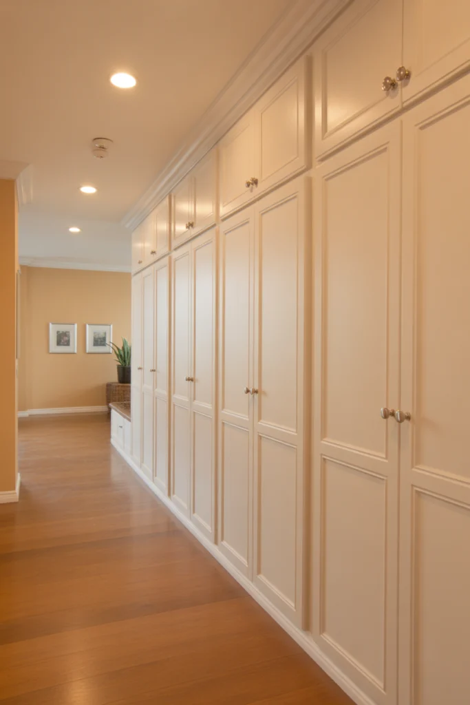 Utilize wall space with built-in cabinets or cubbies. This approach adds storage while keeping the hallway organized and sleek.