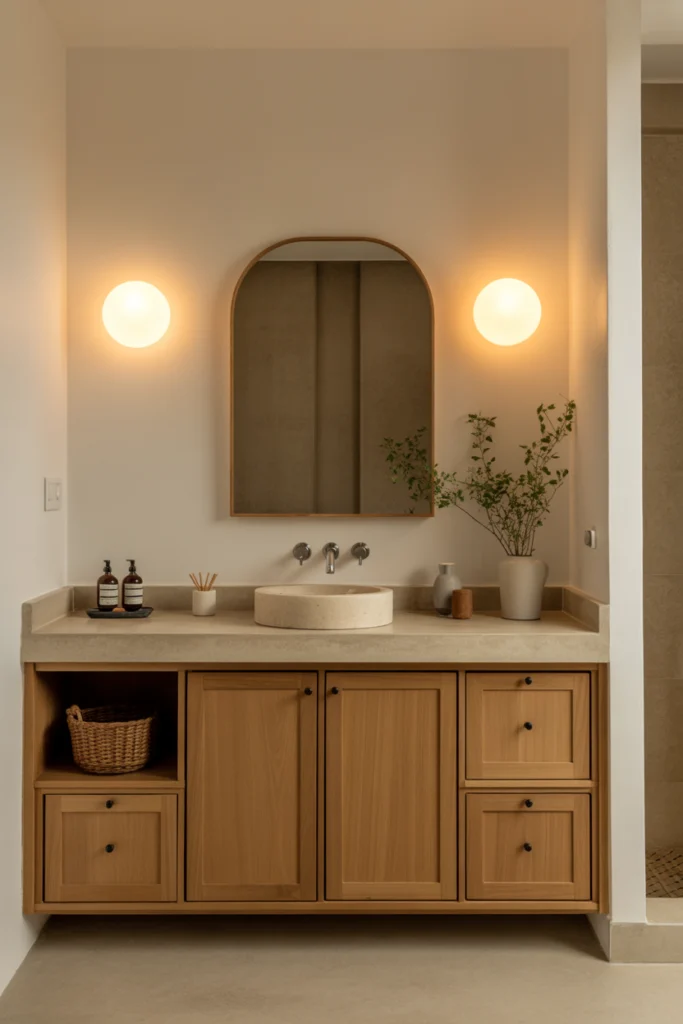10. Natural Wood Vanity Cabinets for Warmth and Texture