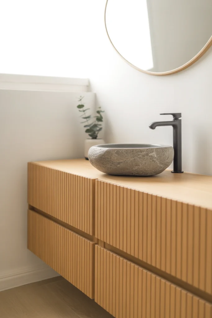 Slatted wood vanity cabinets bring dynamic texture and a modern Scandinavian feel to bathroom design. Their clean vertical or horizontal slats create subtle shadows that add visual depth. In 2026, slatted designs are gaining popularity due to their stylish and minimalist appeal.