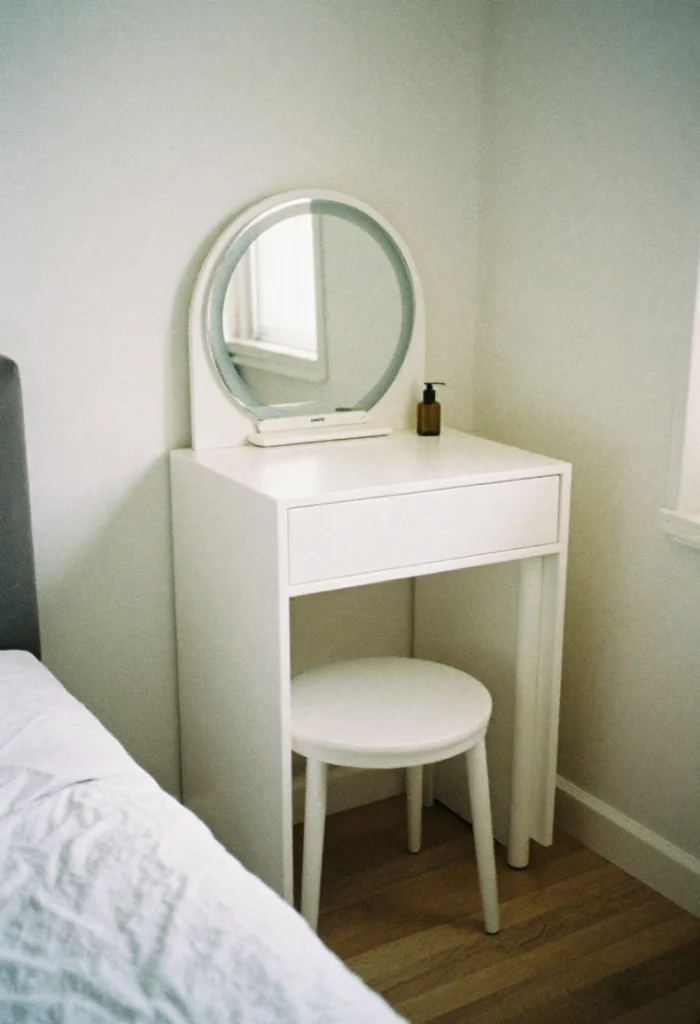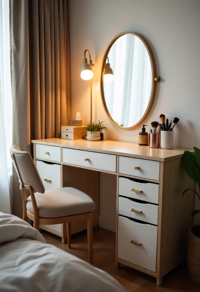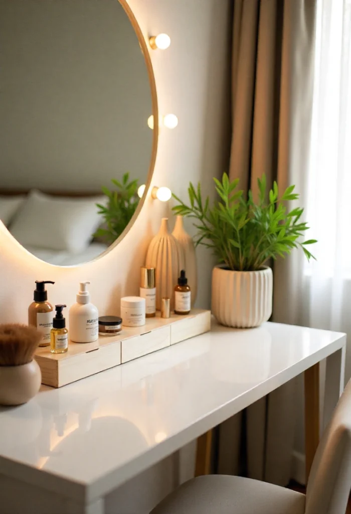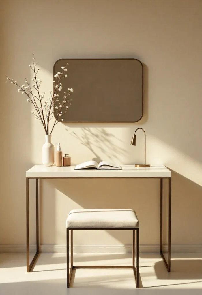 Functionality is maintained through discreet storage options such as shallow drawers or hidden compartments. Minimalist vanity table ideas emphasize quality over quantity, encouraging intentional organization. Paired with a simple mirror and soft lighting, this design creates a calm environment that enhances daily routines. The result is a vanity setup that feels timeless, organized, and effortlessly elegant.