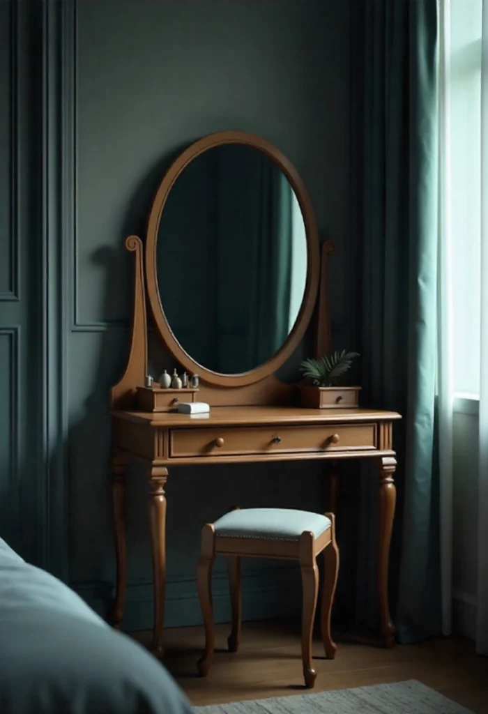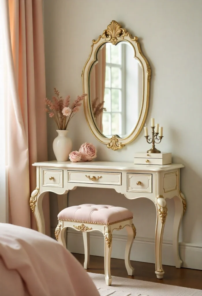 Vintage vanity table ideas draw inspiration from classic designs, featuring ornate details, curved legs, and decorative mirrors. These tables create a romantic and nostalgic atmosphere that adds character to the room. Soft finishes and antique-style hardware enhance their charm.