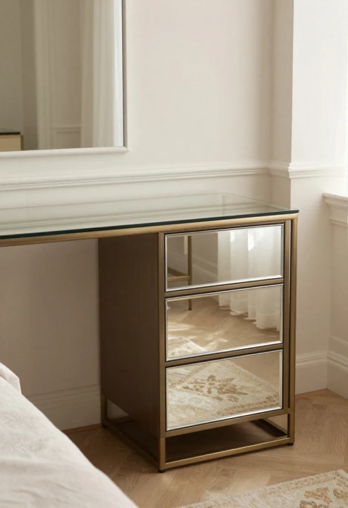 Glass-accented vanity tables add sophistication and lightness to contemporary interiors. As vanity table ideas, they create a sense of openness while maintaining elegance. Glass surfaces reflect light beautifully, enhancing brightness and visual depth within the room. This design works particularly well in modern and luxury spaces.