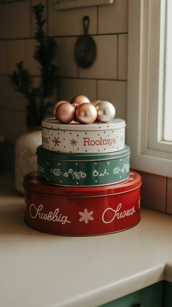 Stack vintage cookie tins filled with ornaments or pine sprigs on shelves or counters. The designs and colors tell stories of holidays past.