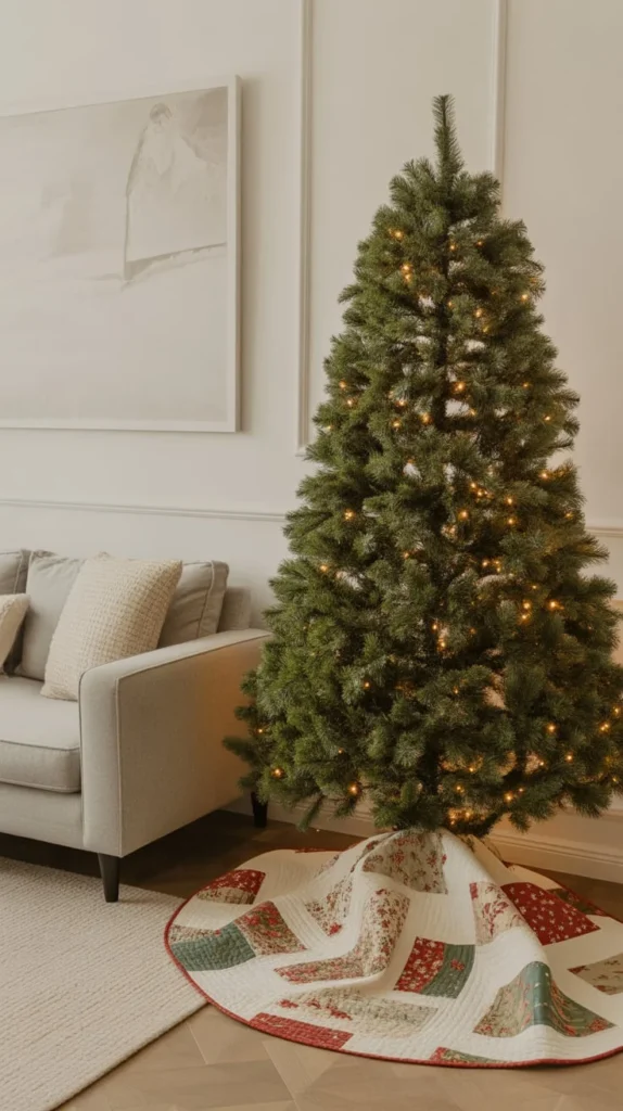 Use or recreate a patchwork quilt as your Christmas tree skirt. The soft patterns and hand-stitched details bring warmth and emotional connection.
