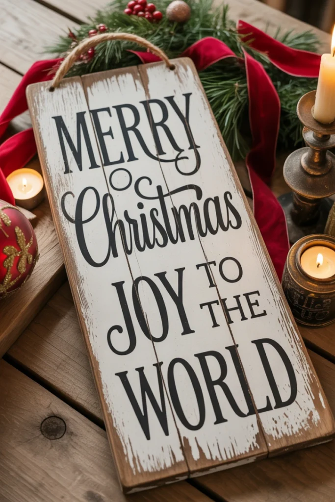 Recreate vintage Christmas signage with reclaimed wood and chalk paint. Add phrases like “Joy to the World” or “Peace on Earth” in classic typography.