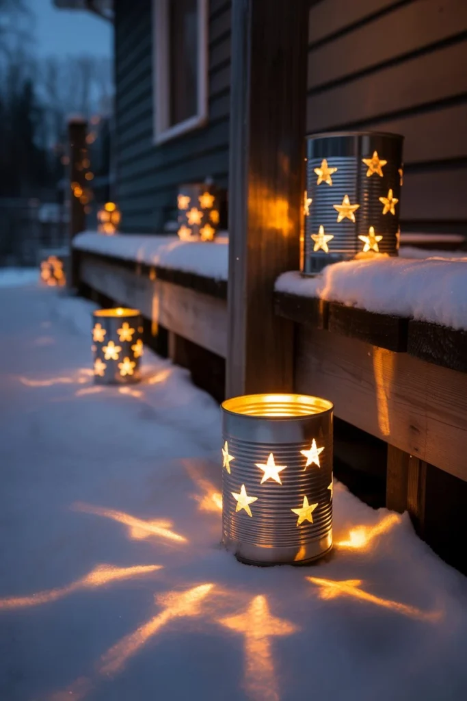 Repurpose tin cans into lanterns by punching star or snowflake patterns into their sides. Paint them white or silver and place tea lights inside.