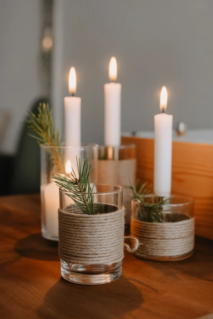 Wrap simple candle holders or jars in twine, lace, and burlap for a farmhouse-inspired glow. Add tiny pine sprigs or cinnamon sticks for a cozy scent and visual appeal.