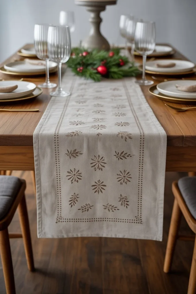 Sew a DIY table runner using linen or muslin fabric, stenciled with old-fashioned holiday motifs like reindeer or holly.
