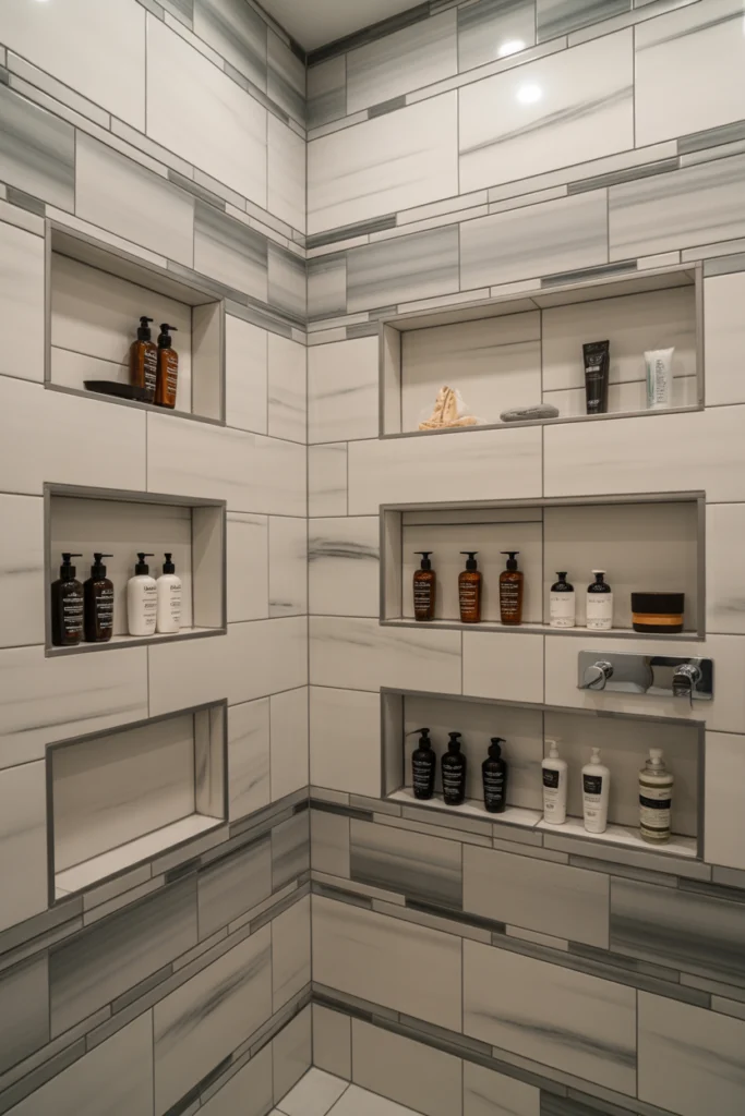 Proper placement ensures accessibility and visual balance. Among walk-in shower ideas, recessed niches improve organization and enhance the shower’s streamlined appearance.