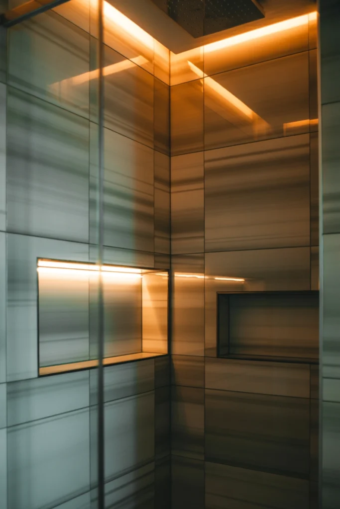 LED lighting enhances ambiance and visibility within the shower. Integrated lighting highlights tile textures, niches, and architectural features.