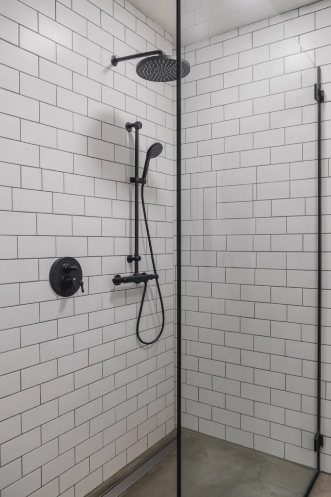 Black fixtures add contrast and contemporary elegance. Against neutral tiles, matte or satin black hardware becomes a strong visual anchor.