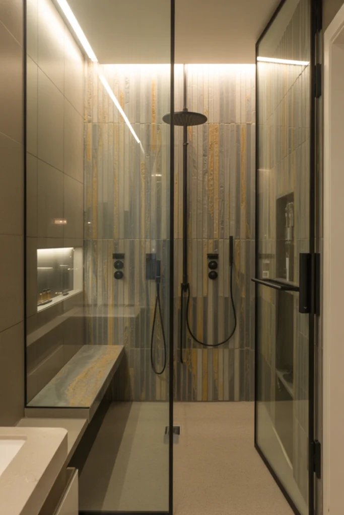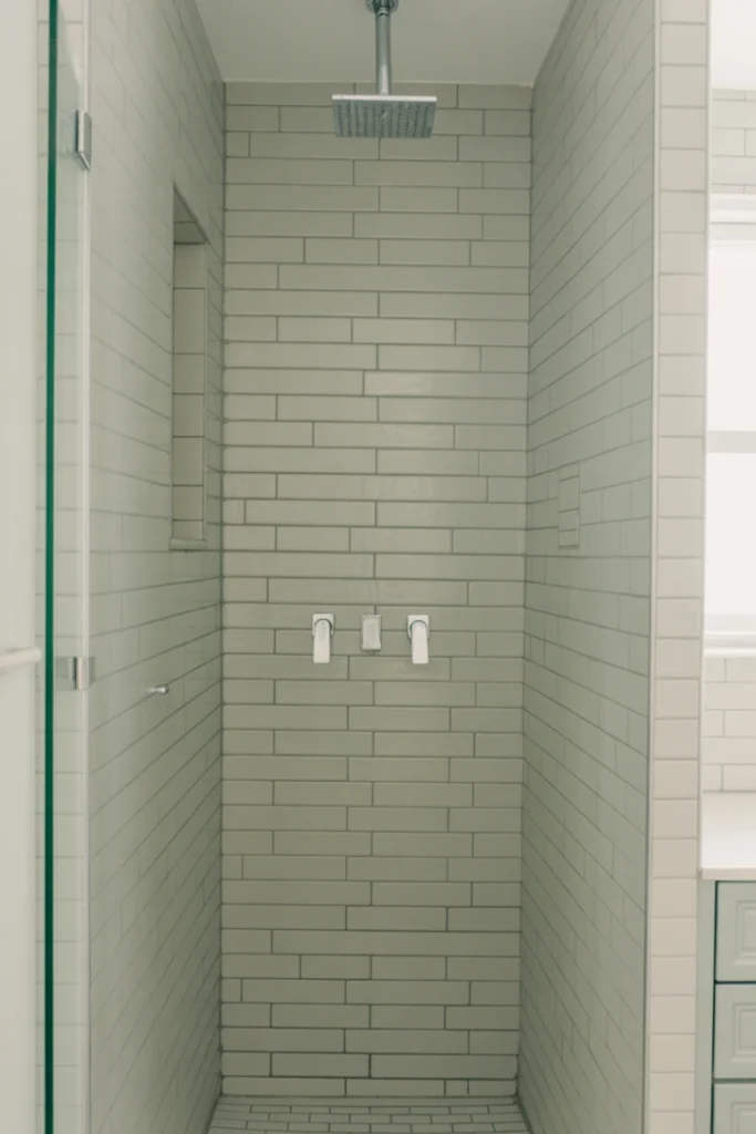 Slim, elongated tiles add modern flair while maintaining visual continuity. Among walk-in shower ideas, vertical tile designs enhance perceived height and architectural interest.