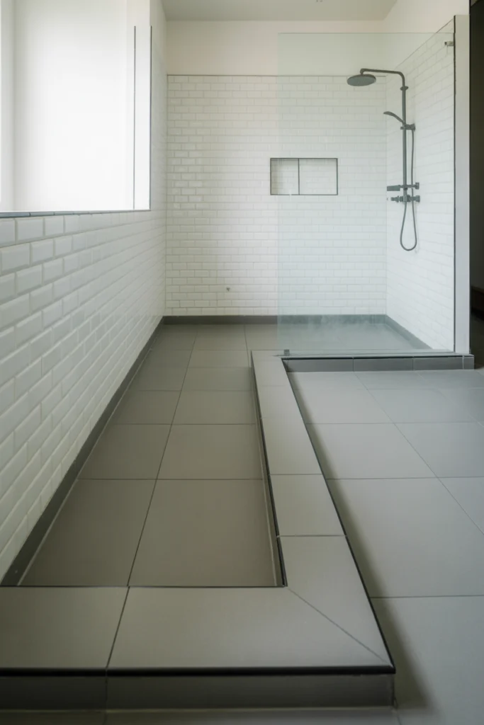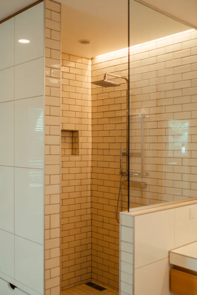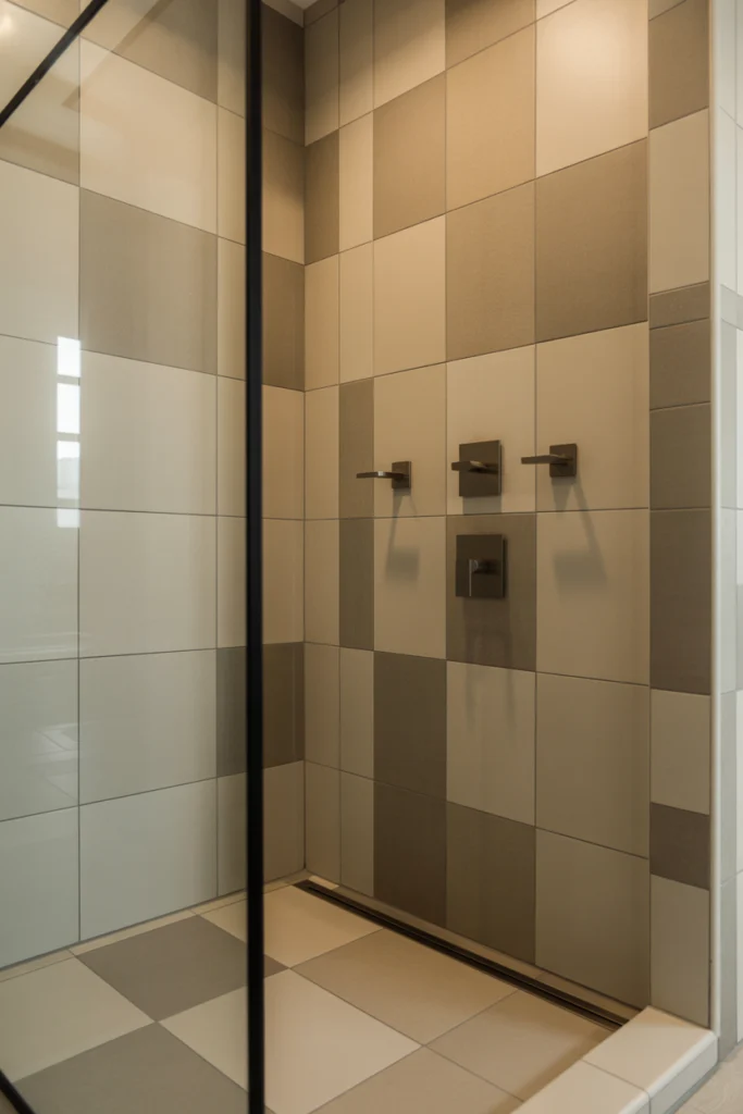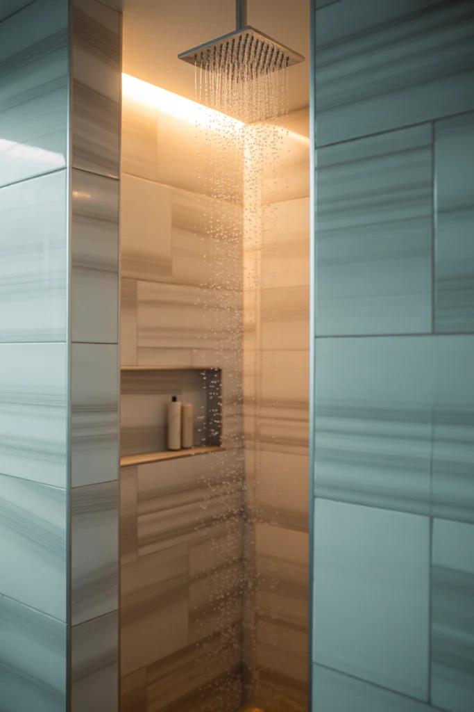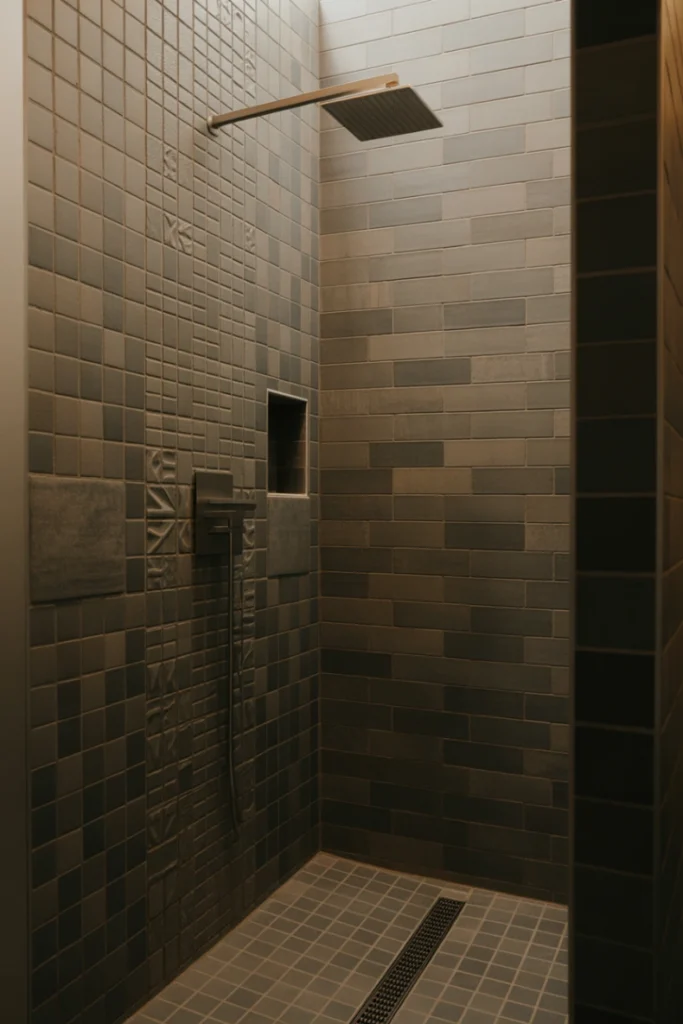 Vertical tile layouts draw the eye upward, making ceilings appear higher and the shower feel more spacious. This technique is especially effective in small or low-ceiling bathrooms.