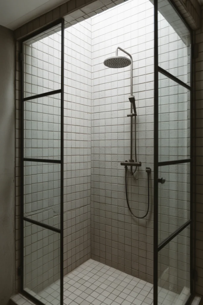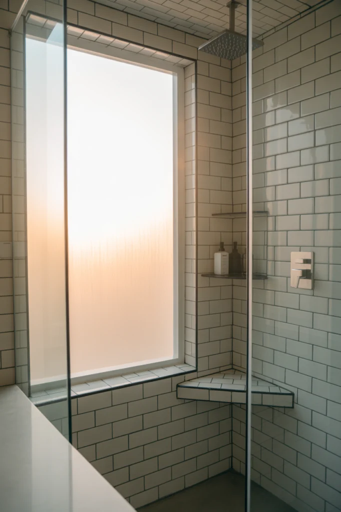A window inside the shower enhances natural light and ventilation. Frosted or elevated windows ensure privacy.