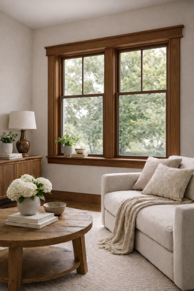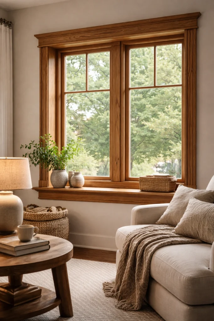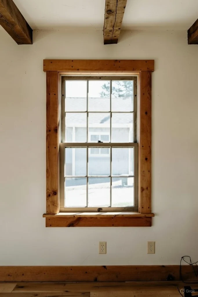 Natural wood window trim brings warmth and organic character into any room. This window trim idea is perfect for homeowners who want a cozy, grounded feel. Wood trim highlights craftsmanship and complements materials like stone, brick, and hardwood floors. Different wood species can dramatically change the look, from rustic oak to sleek walnut.