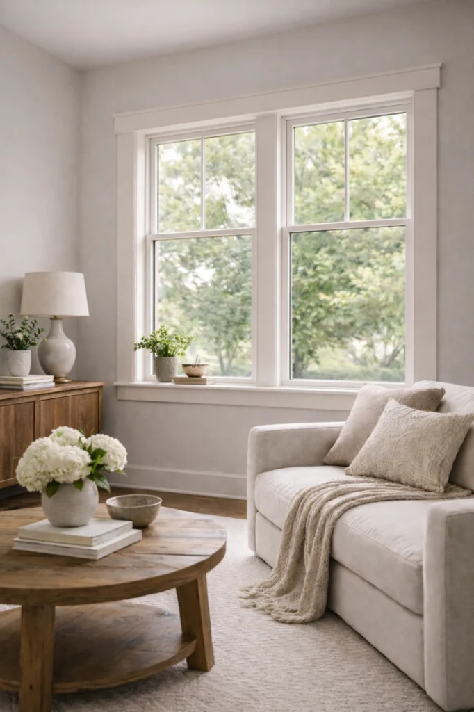 Classic white window trim remains one of the most timeless window trim ideas for homeowners. It works beautifully in nearly every architectural style, from traditional to modern farmhouse. White trim creates a crisp border around windows, drawing attention to natural light while keeping the overall look clean and uncluttered. It pairs especially well with neutral wall colors and wood or tile flooring.
