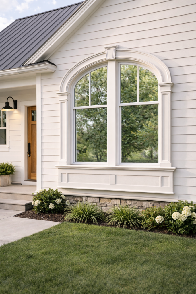 Arched window trim highlights architectural curves and adds elegance. This window trim idea is perfect for Mediterranean, traditional, or historic homes. The curved trim emphasizes the window’s shape and adds visual interest.
