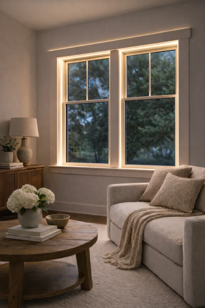 Custom window trim with integrated lighting is a modern and innovative window trim idea. Subtle LED lighting built into trim adds ambiance and highlights architectural details.
