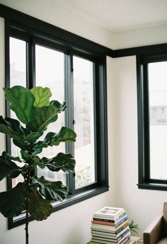 Bold black window trim is a striking option that adds instant drama and contrast. This window trim idea is especially popular in modern, industrial, and contemporary homes. Black trim frames the window sharply, creating a strong visual boundary that draws the eye outward. It works exceptionally well with white or light-colored walls.