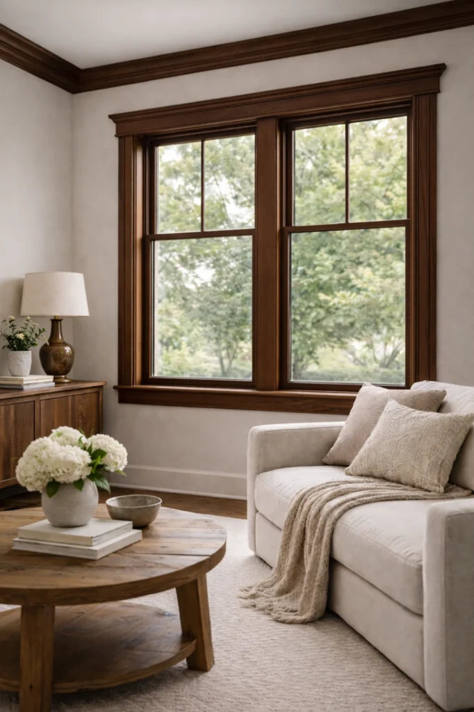 Dark-stained wood window trim creates a rich and dramatic look. This window trim idea works particularly well in formal spaces or homes with traditional architecture. The deep tones provide contrast and add a sense of luxury.