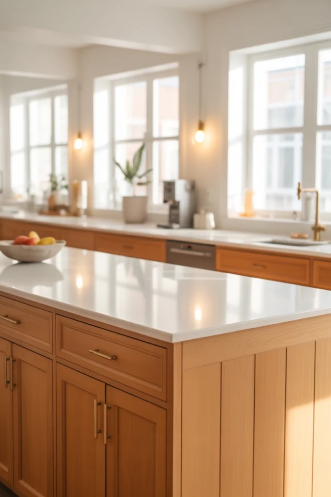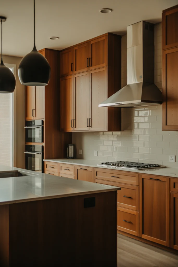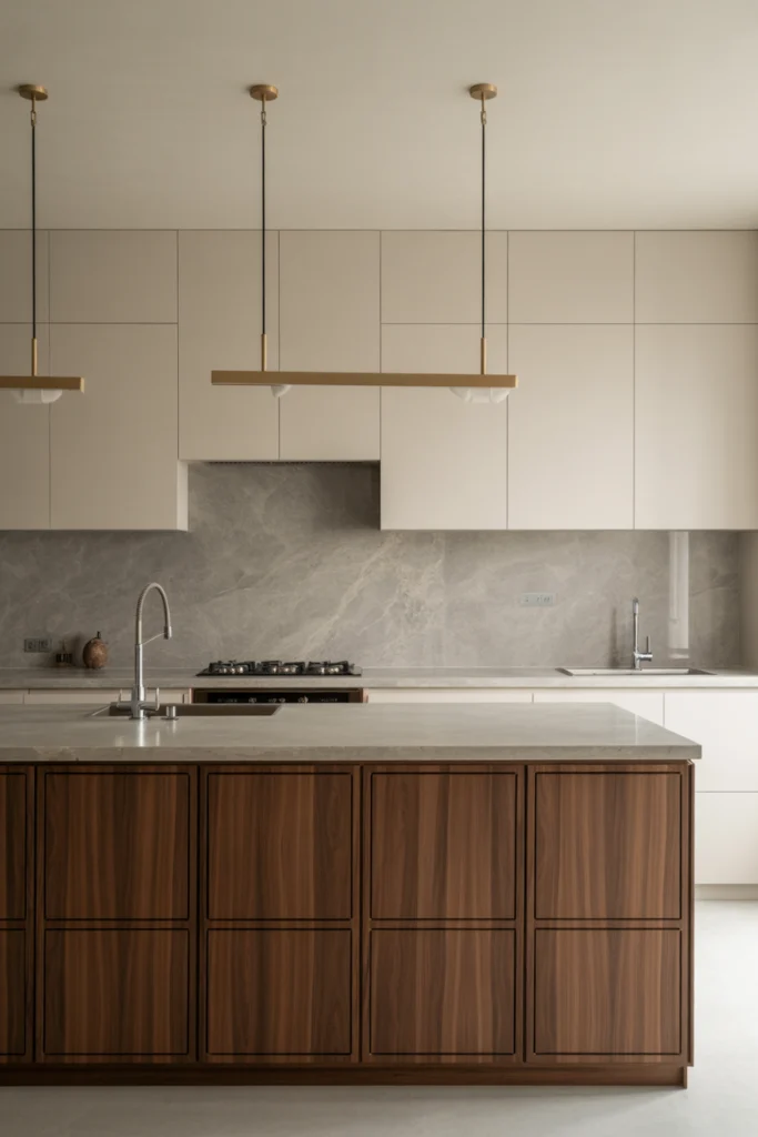 Homeowners often use a contrasting wood tone for the island to create visual separation from the main cabinetry. Adding details like fluted panels, waterfall edges, or built-in shelving can elevate the look further. Lighting also plays a crucial role: pendant lights above the island draw the eye and highlight the wood’s natural beauty.
