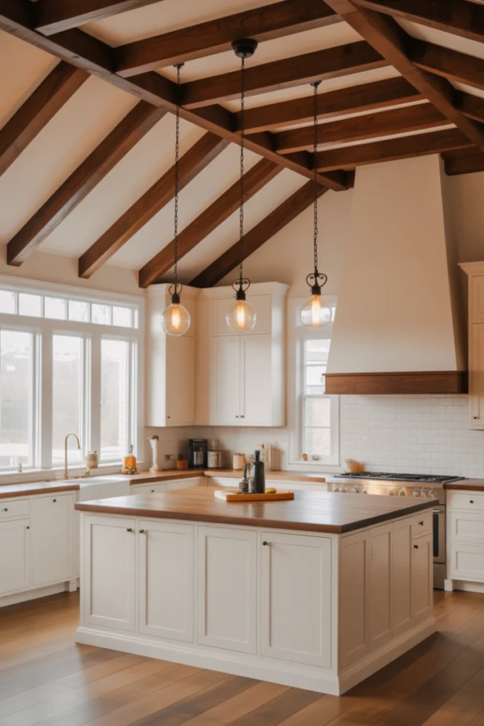 Exposed wood ceiling beams instantly draw attention upward and add architectural interest. They make the kitchen feel more grounded and cozy while giving the space a sense of character. Beams work well in rustic, farmhouse, transitional, and even modern designs depending on their finish. Natural, stained, or distressed beams can completely change the vibe of a kitchen.