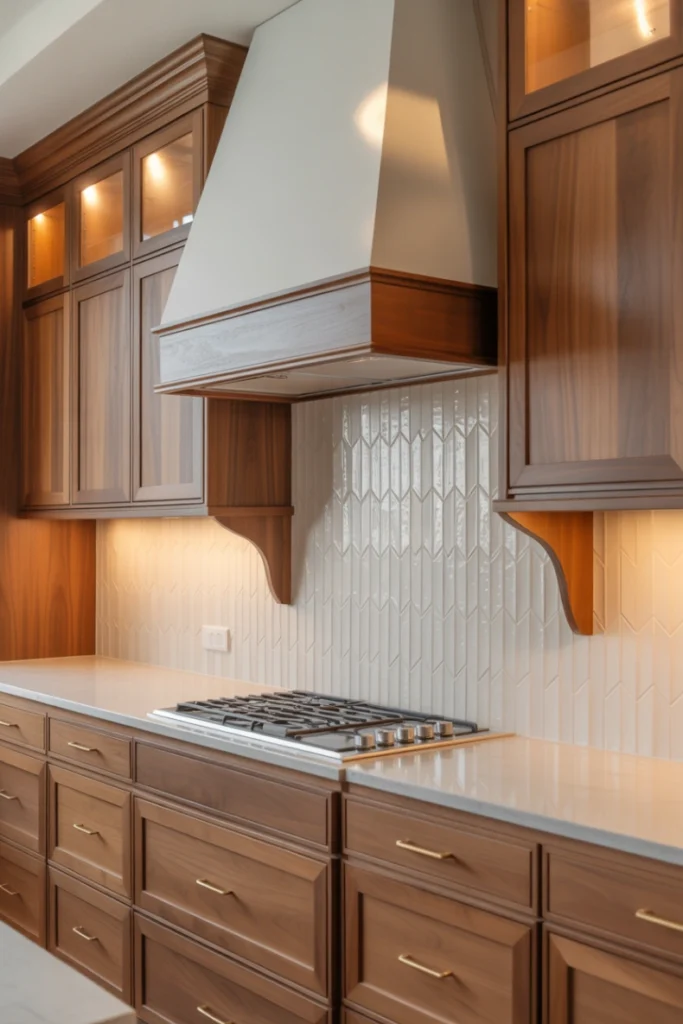 Wood hoods also soften the appearance of stainless steel appliances and add softness to tile or stone backsplashes. Light woods feel modern and Scandinavian, while dark woods give the kitchen a rich, dramatic focal point. This design blends style with practicality and creates a sophisticated central feature in your space.