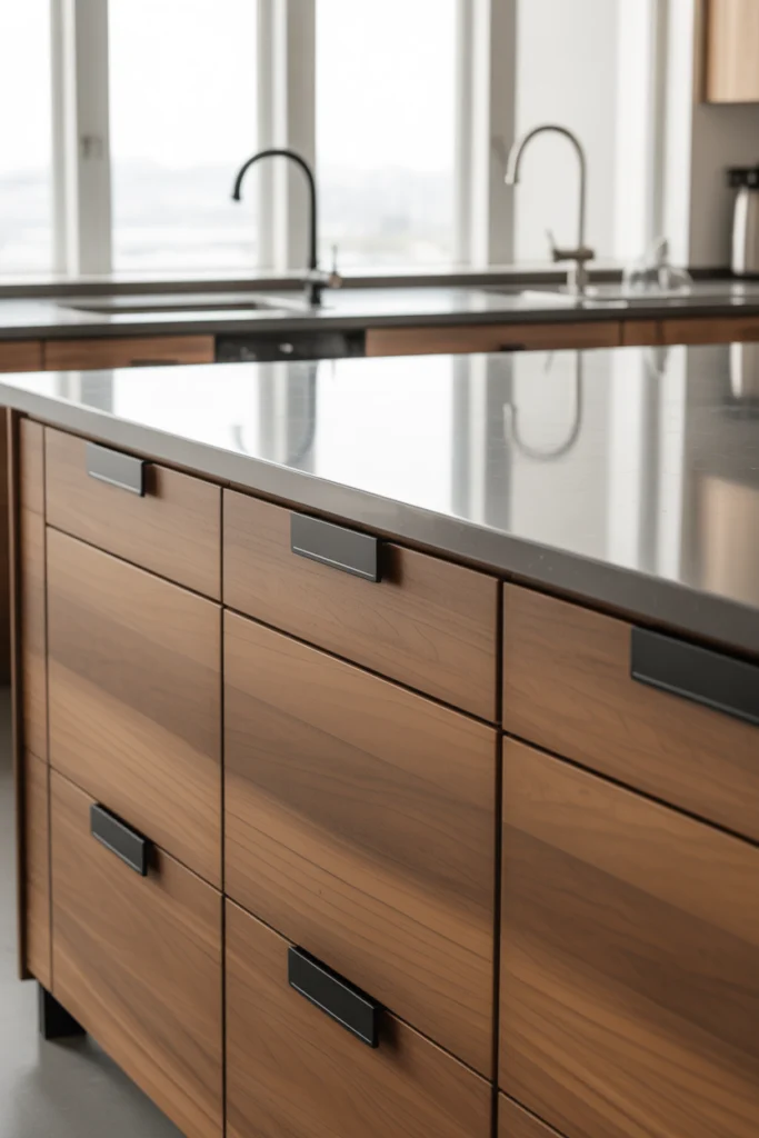 Wood paired with black accents creates one of today’s most sought-after kitchen aesthetics. The warmth of wood softens the boldness of black, resulting in a balanced and modern look. Black hardware, faucets, frames, or lighting fixtures add definition and create beautiful contrast. This style works well in contemporary, Scandinavian, and industrial kitchen designs.