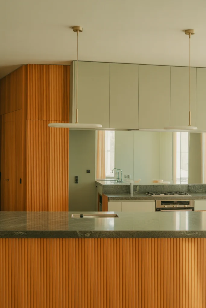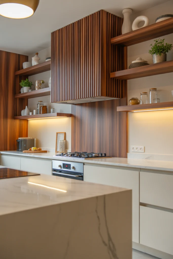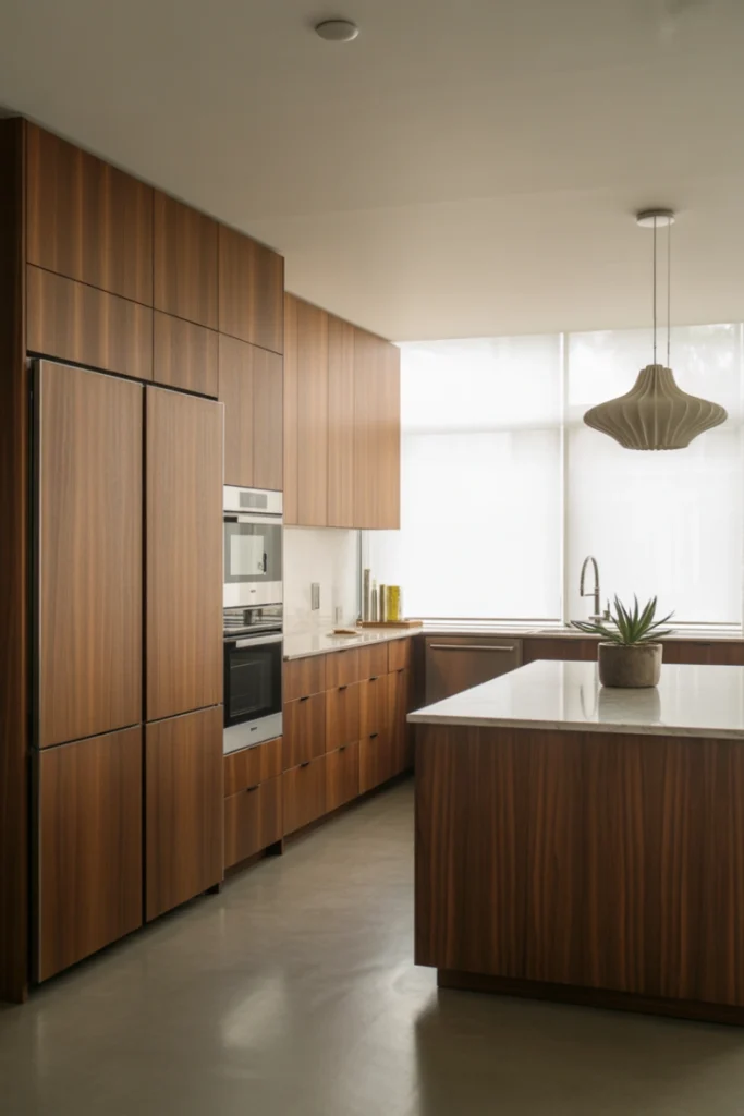 Vertical wood paneling creates height and elegance in kitchen design. Whether used on the island, cabinets, or walls, vertical lines add visual lift and sophistication. This style looks modern, clean, and slightly luxurious. Light or medium-toned wood enhances the natural warmth of the space.