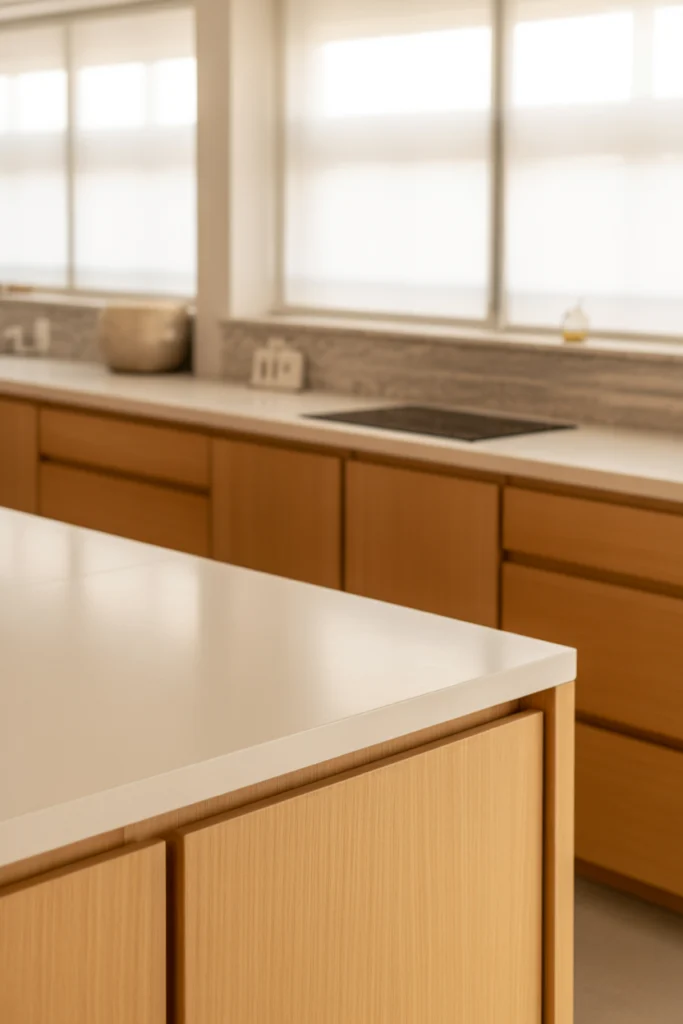 Designers often choose lighter wood species like oak, maple, or birch for kitchens that need brightness. The natural tones bounce light around the room and make the space appear bigger and more open. Combining natural wood with white countertops or soft-neutral backsplashes keeps the palette balanced and airy. This style offers long-term practicality because natural finishes age gracefully, becoming even more attractive over time.