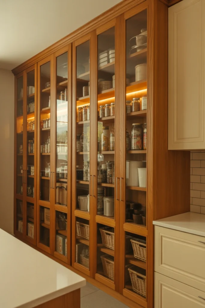 To optimize the space, choose cabinets with adjustable shelves, pull-out drawers, and labeled sections. The warm wood tones keep the pantry area visually appealing while remaining practical. This design works well for both small kitchens and large layouts that require extra organization.