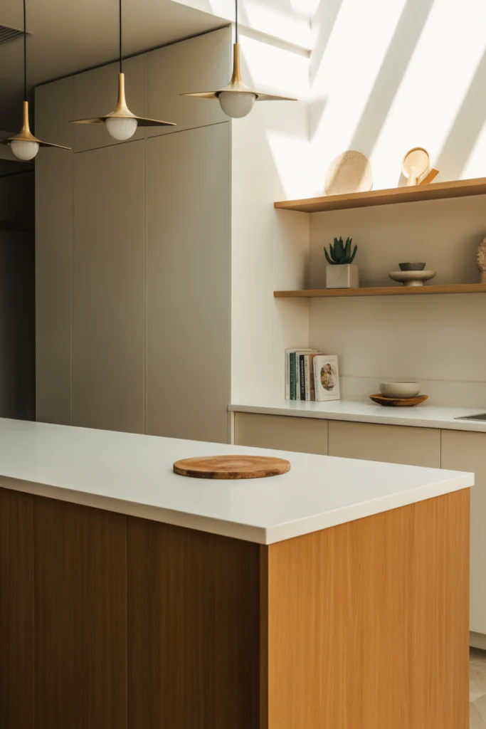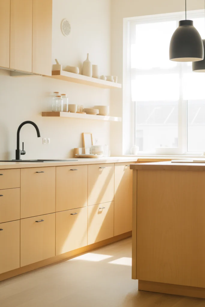 To complete this aesthetic, pair light-toned wood with white walls, matte black accents, and soft-textured textiles like linen. Open shelving is common in Scandinavian designs and allows the wood to shine as a natural focal point. The result is a kitchen that feels refreshing, balanced, and effortlessly stylish — a perfect blend of comfort and minimalism.
