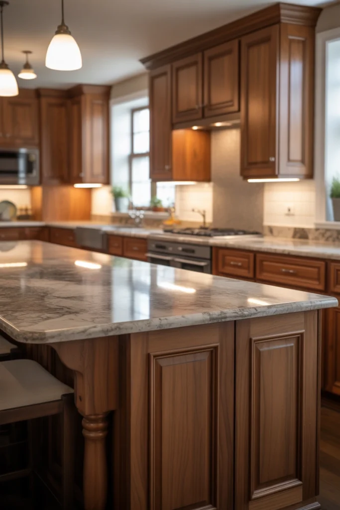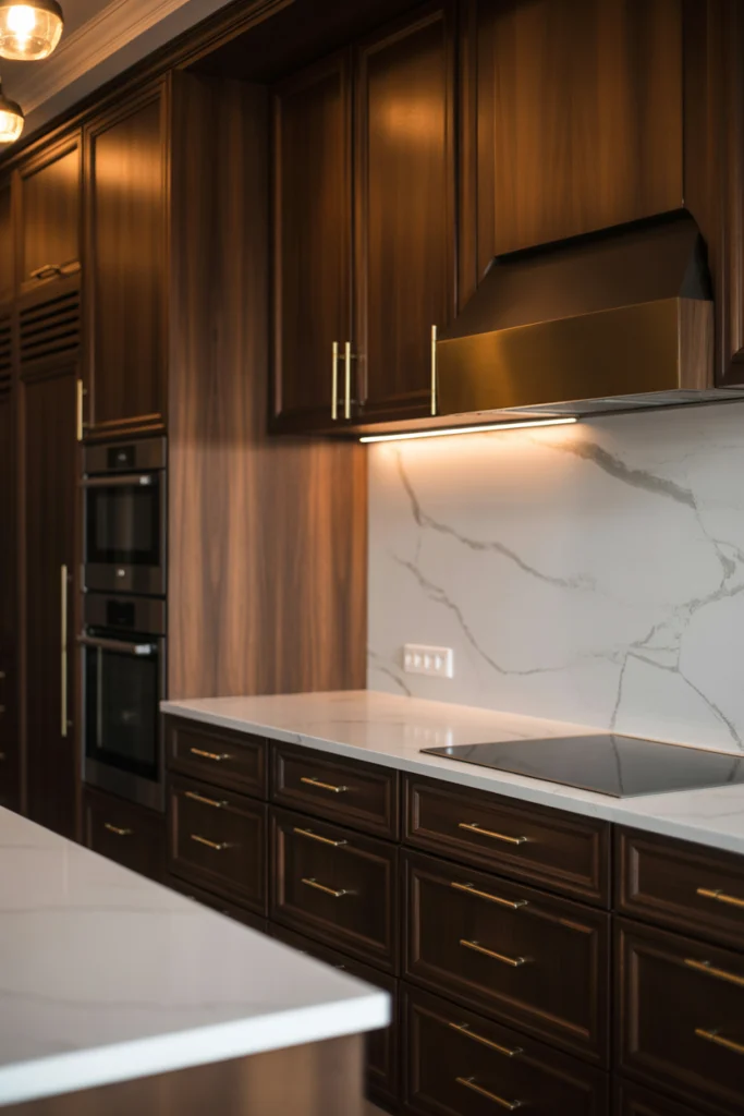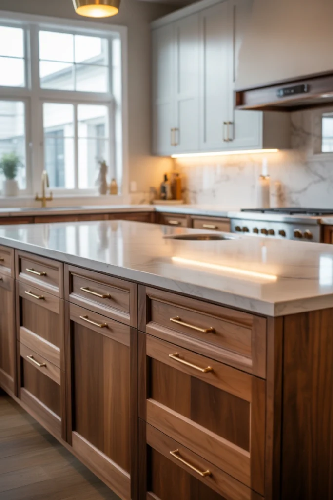 Dark walnut cabinetry adds instant sophistication to any kitchen. With its dramatic grain pattern and deep chocolate tones, walnut is ideal for creating a luxurious, high-end look. This wood pairs beautifully with gold, brass, or black accents, making it a favorite for modern and transitional kitchens. When paired with soft lighting, walnut adds richness without feeling overwhelming. It’s the perfect choice for homeowners wanting a bold yet timeless design.