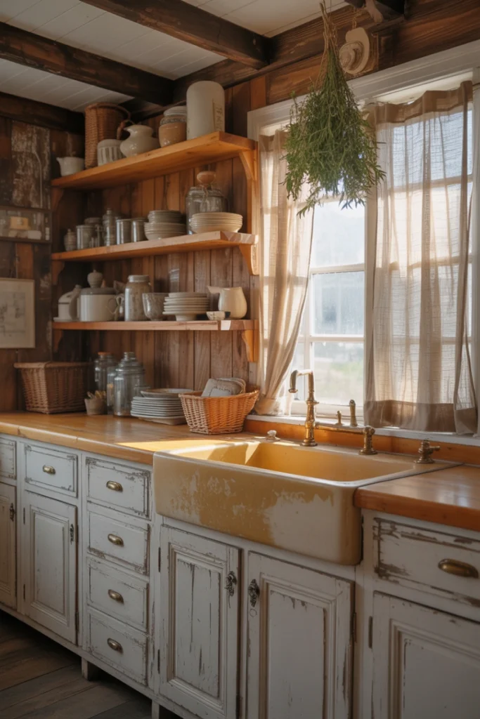 Rustic farmhouse kitchens embrace warm, distressed woods that bring charm and character into your home. Think reclaimed beams, knotty pine cabinets, open shelving, and vintage-style hardware. This style aims for authenticity and comfort, making the kitchen feel lived-in and welcoming. Wood with knots, imperfections, and texture is encouraged because it adds depth and personality.