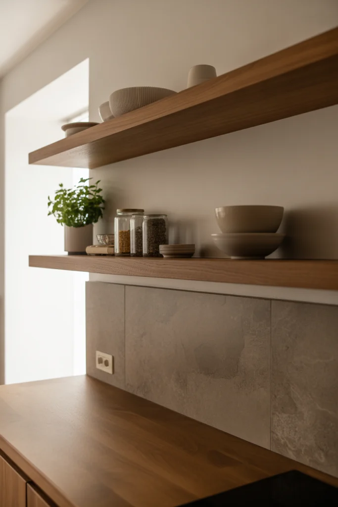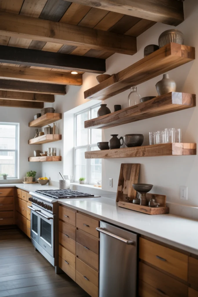 To maintain a balanced design, combine open shelving with closed cabinetry. This prevents the kitchen from feeling cluttered while still providing easy access to daily essentials. Using sturdy wood like oak or maple ensures shelves remain strong and long-lasting. With thoughtful styling, wood open shelving turns your kitchen into a beautiful and functional space.