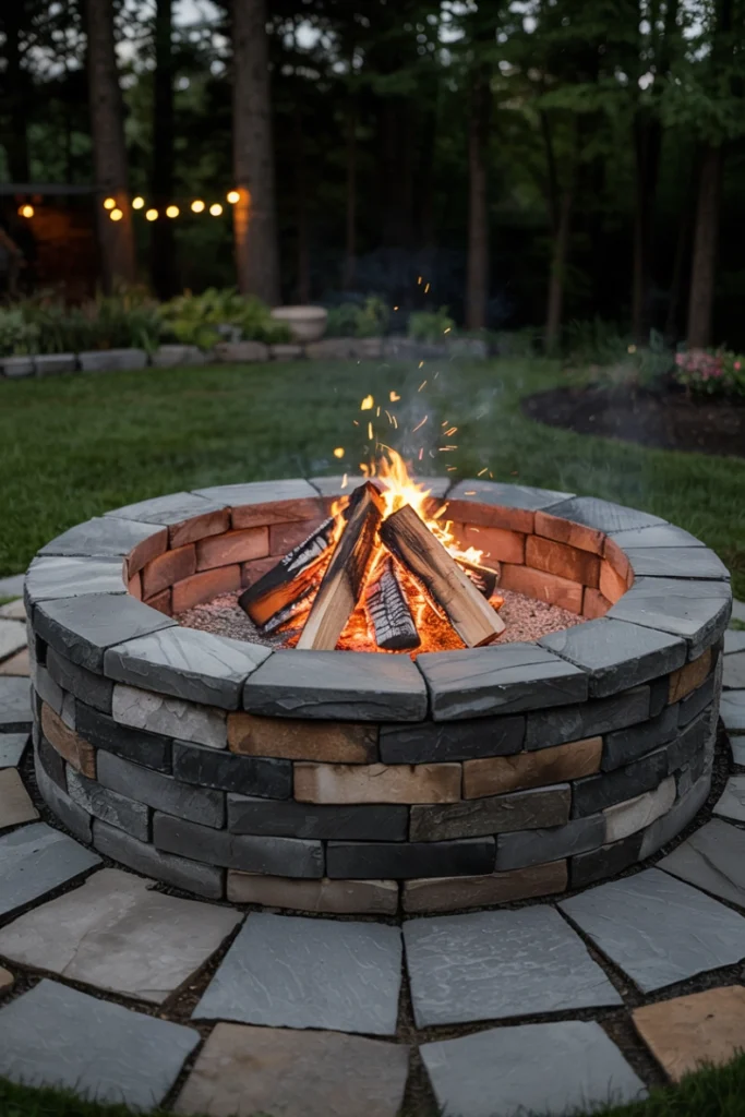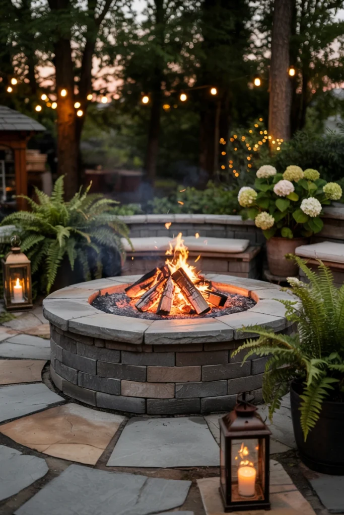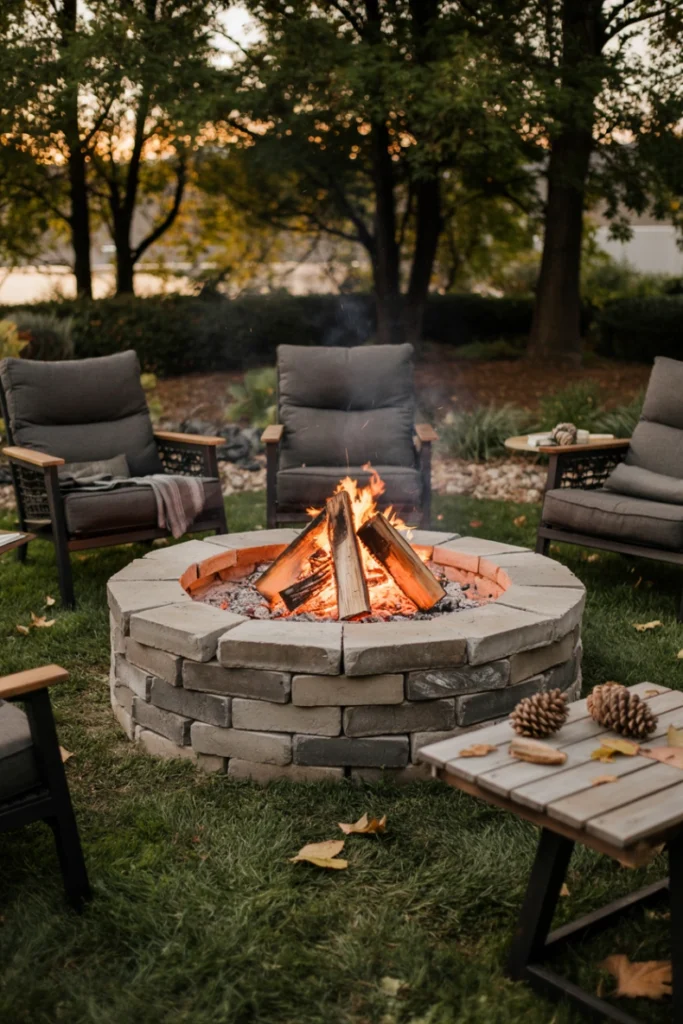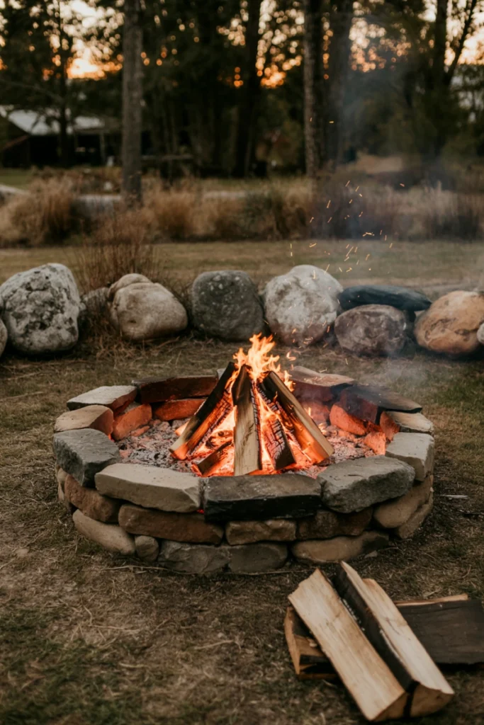 Farmhouse-style fire pits emphasize warmth and simplicity. This yard fire pit idea uses natural materials and traditional forms.