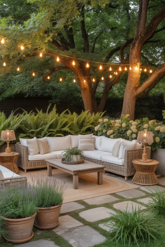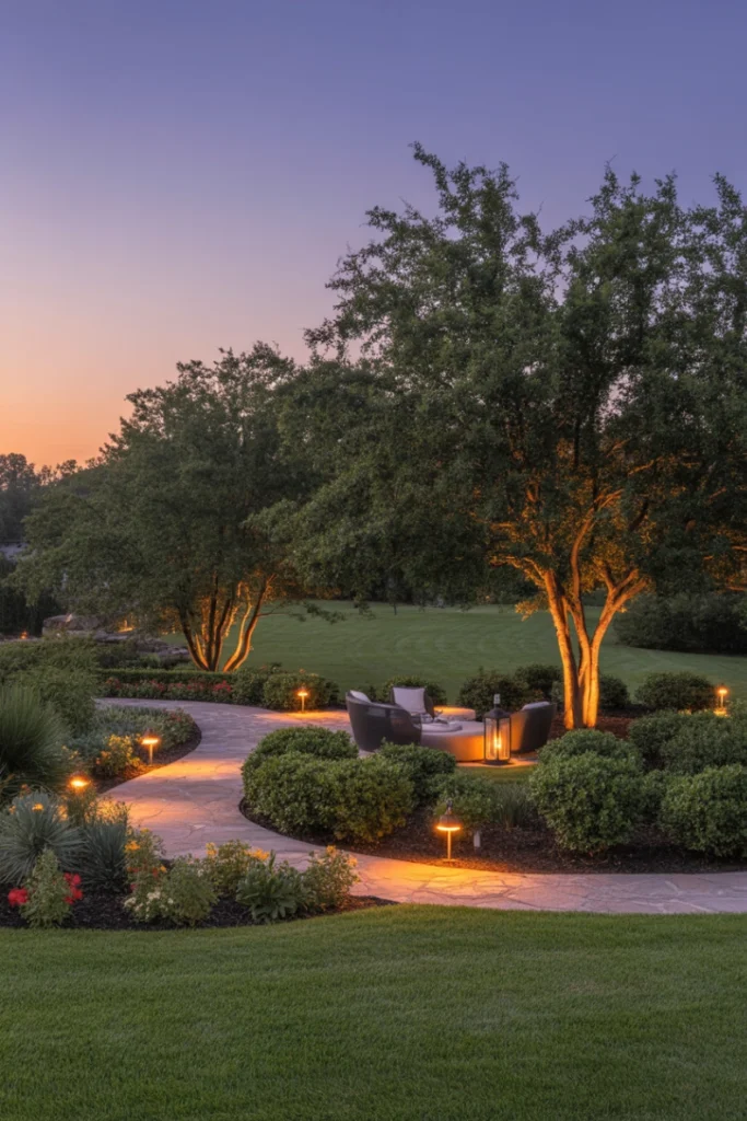 Outdoor lighting enhances both beauty and functionality. Strategically placed lights illuminate pathways, seating areas, and landscape features, making the yard usable after dark. Soft lighting creates ambiance while improving safety.